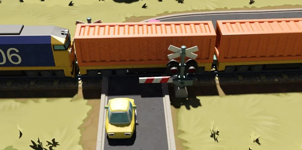 This animation was used to communicate three proposed options for a new rail crossing to the community focusing on the overall design. The friendly cartoon style was deliberately used to avoid confusion about the rail alignments exact interaction with property boundaries that might be unintentionally inferred with a geographically accurate terrain map commonly used in visualisation as the designs were only in community consultation phase.